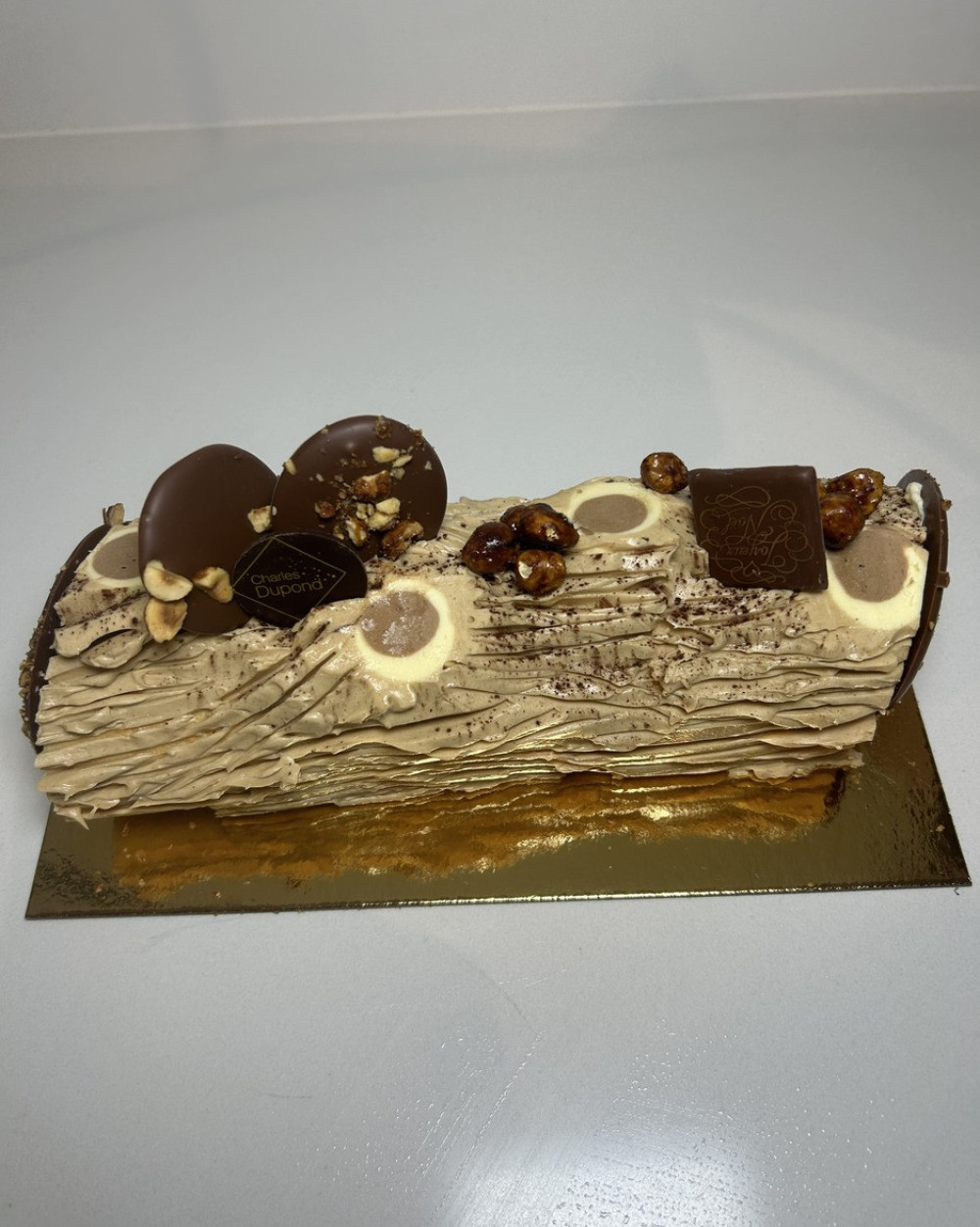 bûche tradition praliné : biscuit cuillère traditionnellement roulé avec sa crème au beurre praliné et son biscuit imbibé rhum