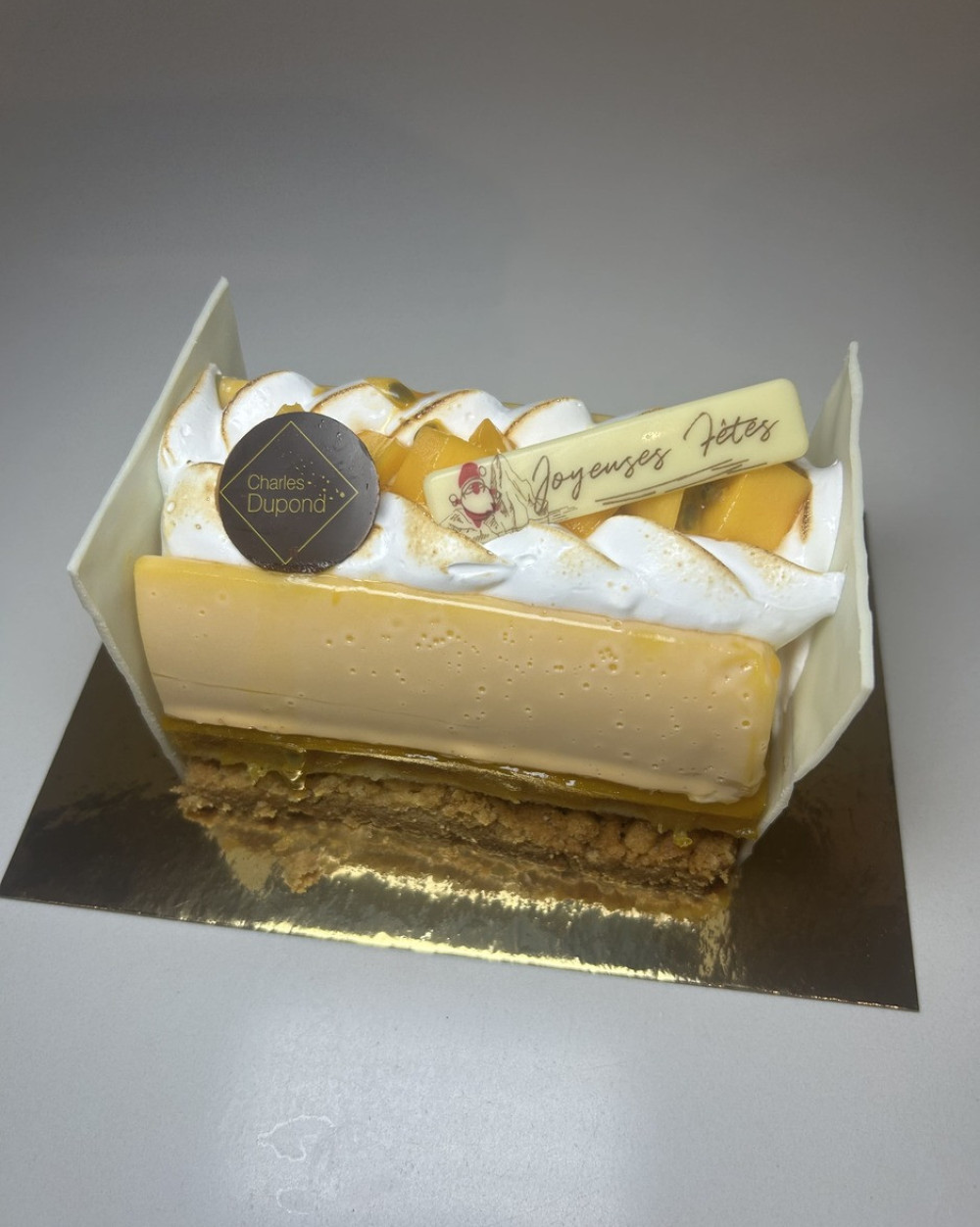 marmelade d'ananas caramélisés, crémeux exotique (mangue, passion, banane) sur un biscuit madeleine.